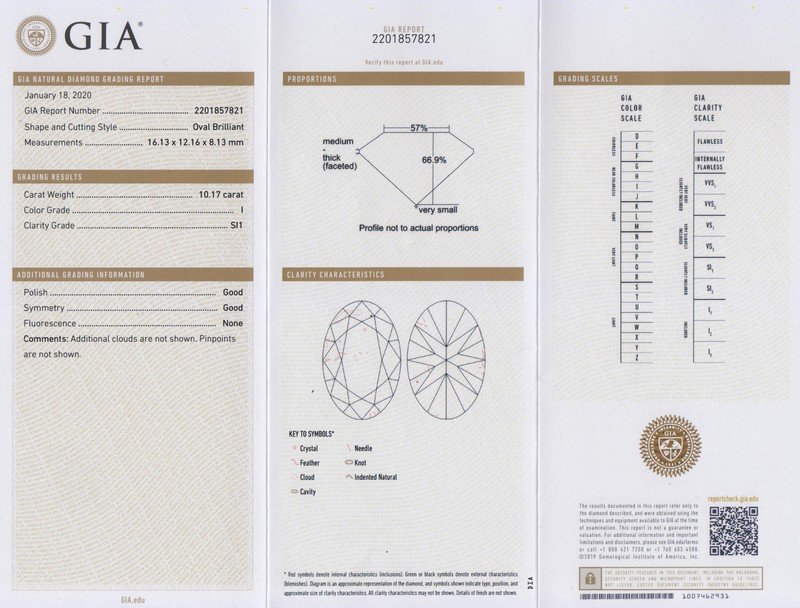 GIA, 2020, Report number 2201857821, 10.17 carats, I color, SI1 clarity, No fluorescence