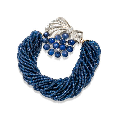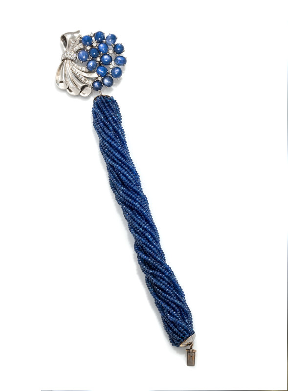 Containing 14 round and oval shape cabochon cut sapphires and 43 round brilliant and single cut diamonds weighing approximately 0.80 carat total. With later attached torsade bracelet consisting of 18 strands of sapphire beads measuring approximately 2.55-3.00 mm in diameter. Mounted in platinum, with white gold clasp.