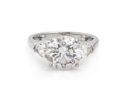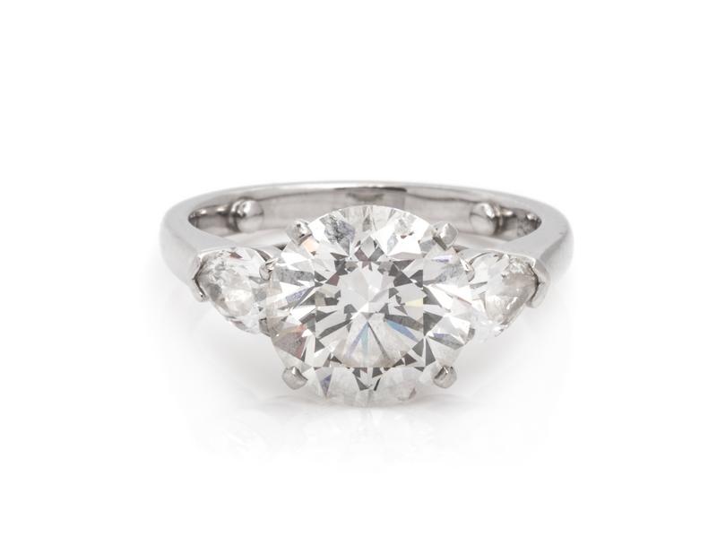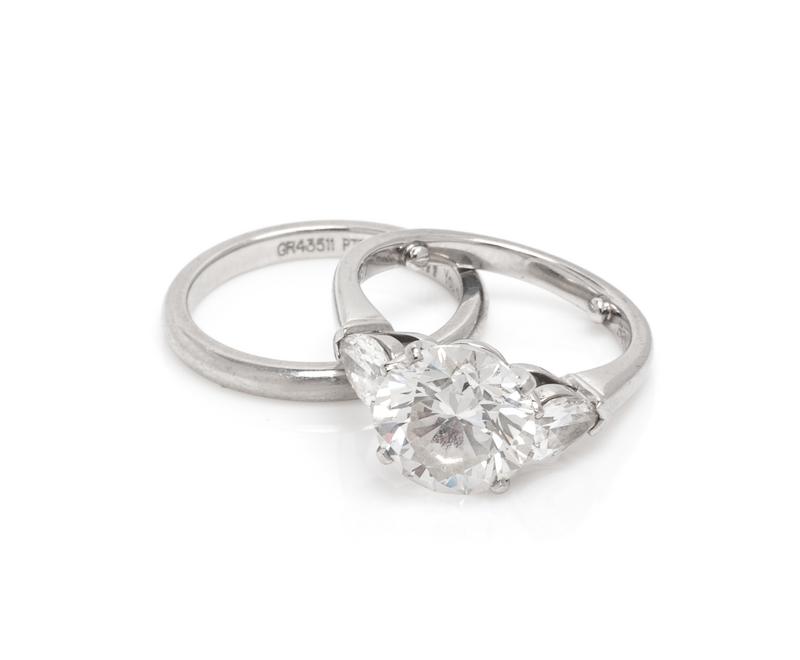 Consisting of a ring containing one round brilliant cut diamond weighing 3.04 carats and two pear shape diamonds weighing approximately 0.67 carat total, together with a Graff platinum band.