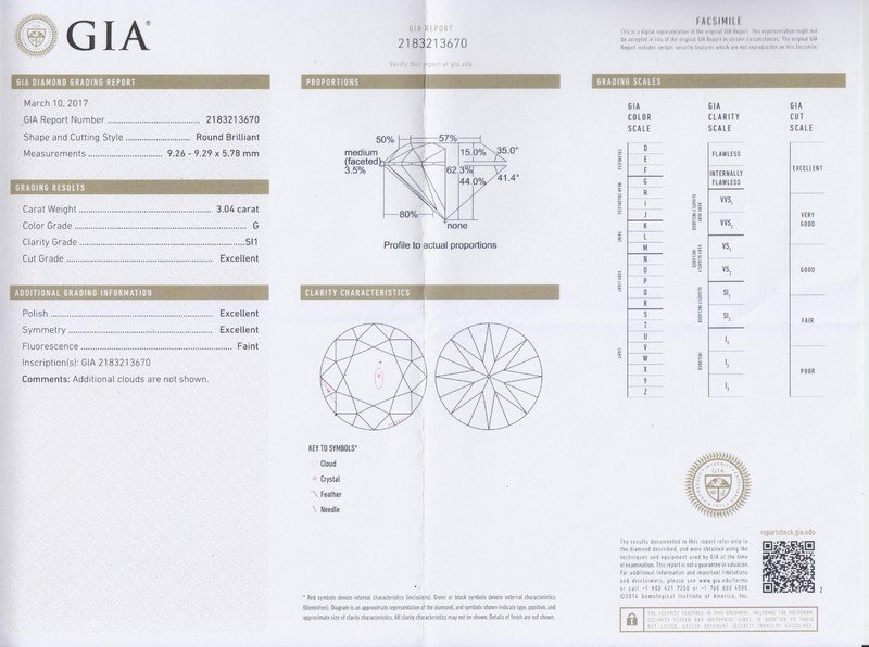 GIA copy, 2017, Report number 2183213670, 3.04 carats, G color, SI1 clarity, Excellent cut, polish and symmetry, Faint fluorescence