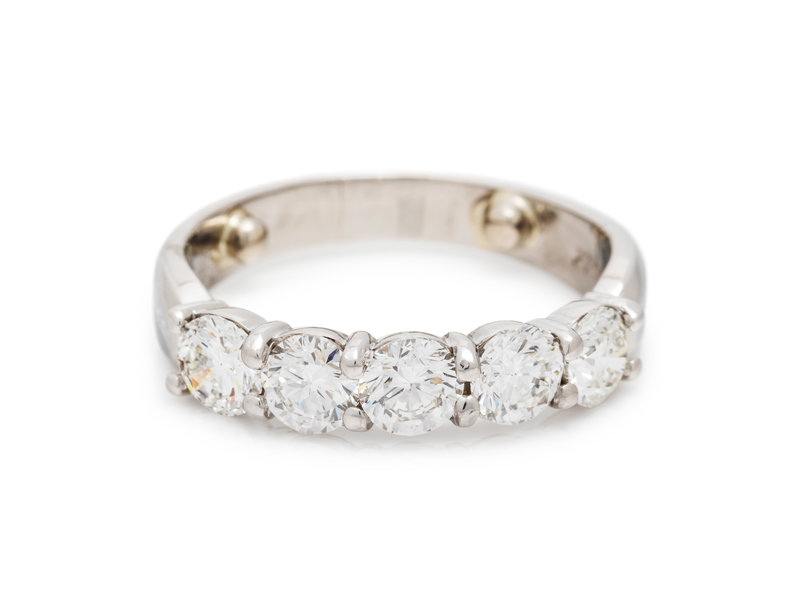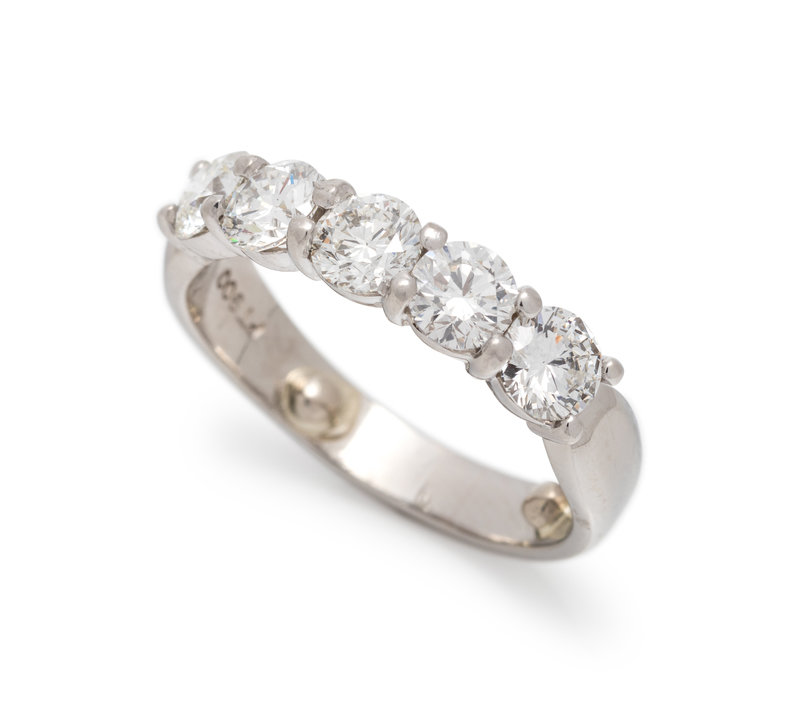 Containing five round brilliant cut diamonds weighing approximately 1.75 carats total. Mounted in platinum.