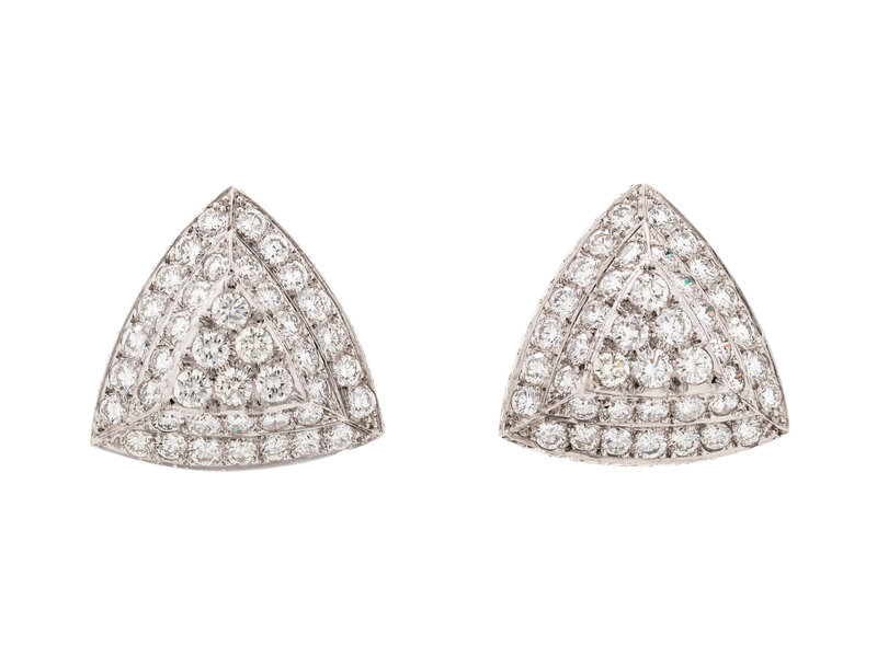 Containing 150 round brilliant cut diamonds weighing approximately 6.50 carats total. Mounted in platinum with white gold clip backs.
