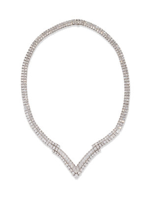 Containing 151 round brilliant cut diamonds, 142 emerald cut diamonds and four tapered baguette cut diamonds weighing approximately 42.00 carats total. Mounted in white gold.
