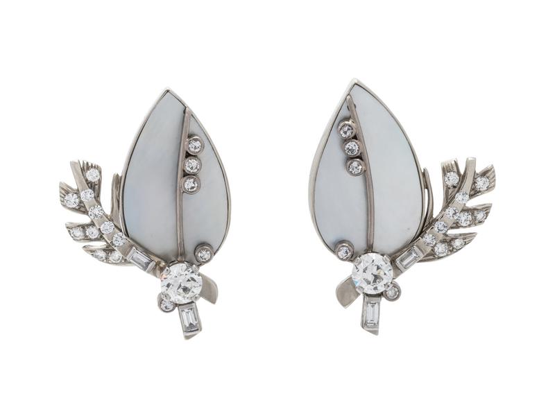 Containing two old European cut diamonds weighing approximately 1.60 carats total, 30 round brilliant cut diamonds weighing approximately 0.90 carat total, four baguette cut diamonds weighing approximately 0.30 carat total, with mother-of-pearl plaques, posts with clip backs. Mounted in platinum and white gold.