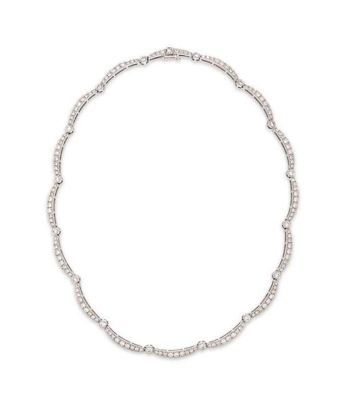 Containing 158 round brilliant cut diamonds weighing approximately 5.30 carats total. Mounted in white gold.