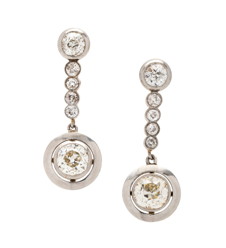 Containing two old European cut diamonds weighing approximately 2.30 carats total, two old European cut diamonds weighing approximately 0.80 carat total and eight old European cut diamonds weighing approximately 0.45 carat total. Mounted in platinum topped yellow gold.