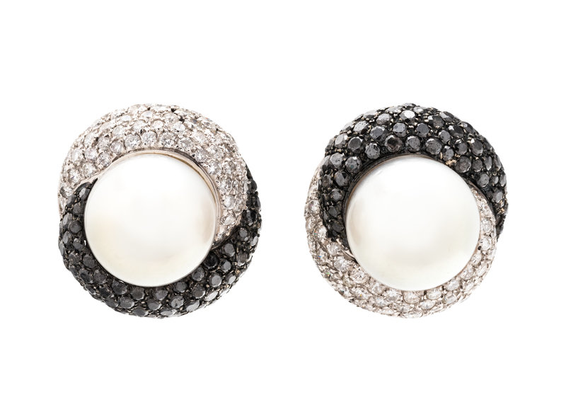 Containing two South Sea pearls measuring approximately 13.80 mm in diameter, numerous round brilliant cut diamonds weighing approximately 3.30 carats total and numerous black diamonds (origin of color not tested) measuring approximately 1.50-2.05 mm in diameter. Mounted in white gold with black rhodium detail.