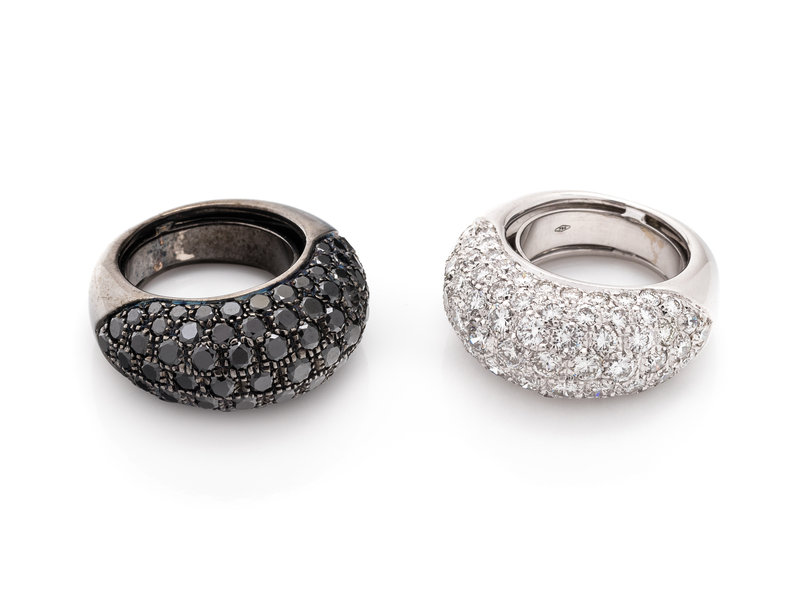 Consisting of a white gold ring containing 80 round brilliant cut diamonds weighing approximately 2.65 carats total, together with a gold ring with black rhodium containing 80 round mixed cut black diamonds (origin of color not tested) measuring approximately 1.60-2.15 mm in diameter.
