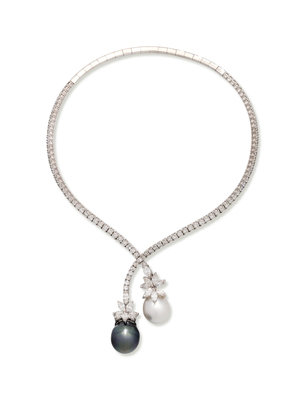 Containing one Tahitian pearl measuring approximately 17.00 x 14.00 mm, one South Sea pearl measuring approximately 16.50 x 13.50 mm, 16 marquise cut diamonds weighing approximately 3.00 carats total and 101 round brilliant cut diamonds weighing approximately 6.00 carats total. Mounted in white gold.