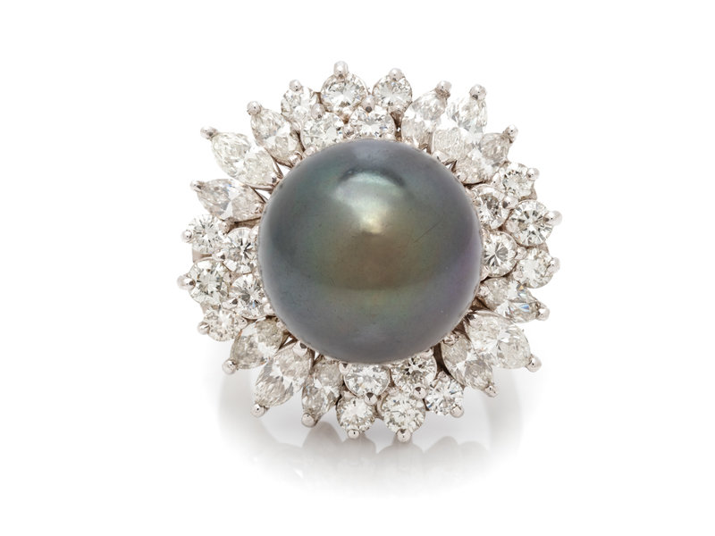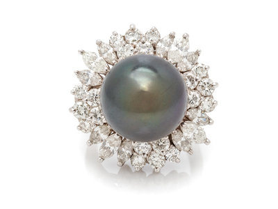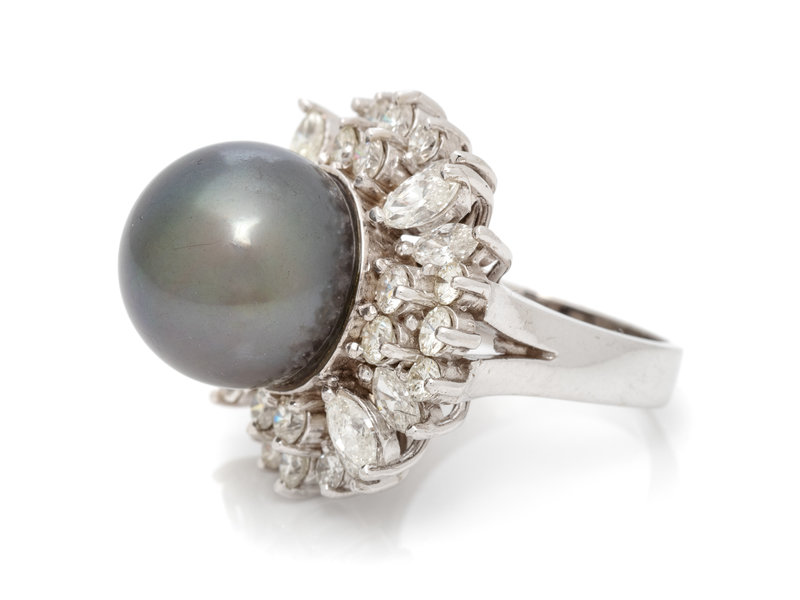 Containing one Tahitian pearl measuring approximately 14.45 mm in diameter with 20 round brilliant cut and 12 marquise cut diamonds weighing approximately 2.50 carats total. Mounted in white gold.