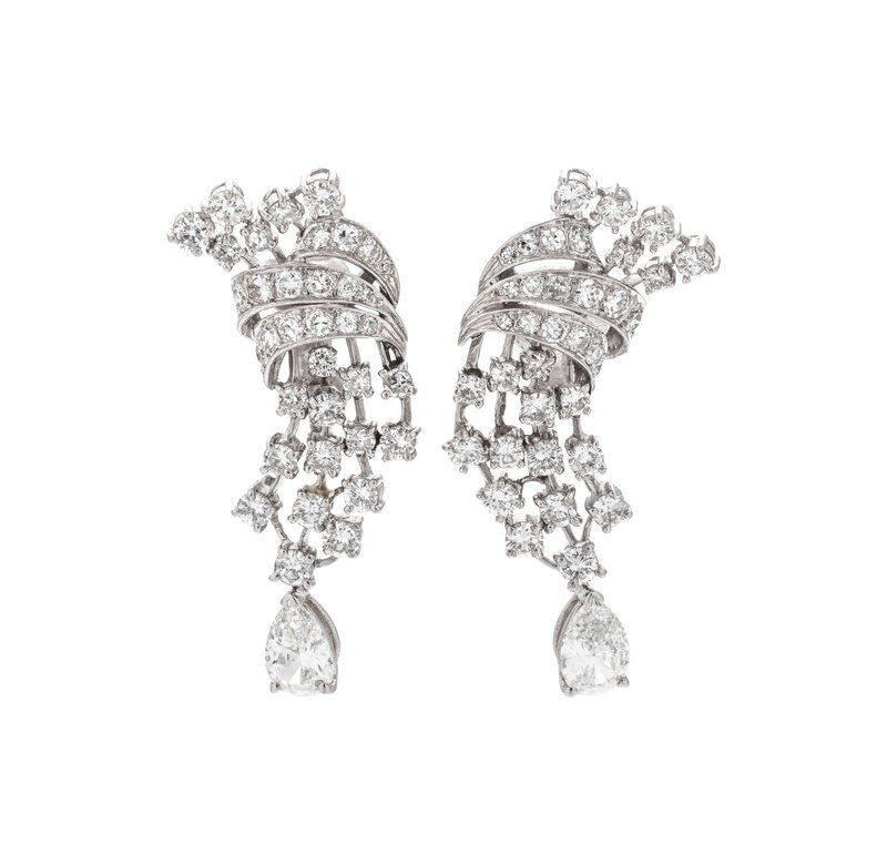 Containing two pear shape diamonds weighing approximately 1.40 carats total and 72 round brilliant and single cut diamonds weighing approximately 1.50 carats total. Mounted in platinum and white gold.