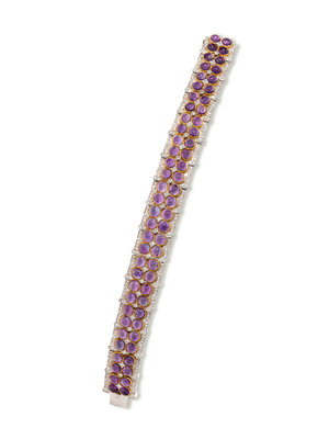 Containing 64 round cabochon cut amethyst measuring approximately 4.70 mm in diameter and numerous round brilliant cut diamonds weighing approximately 2.65 carats total. Mounted in bicolor gold.