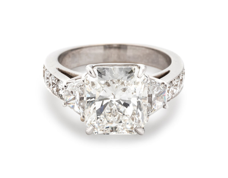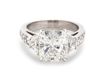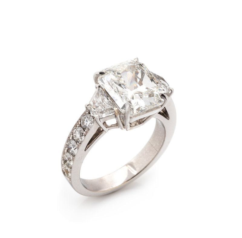 Containing one radiant cut diamond weighing 5.01 carats, two trapezoid shape step cut diamonds weighing approximately 0.80 carat total and 10 round brilliant cut diamonds weighing approximately 0.80 carat total. Mounted in white gold.