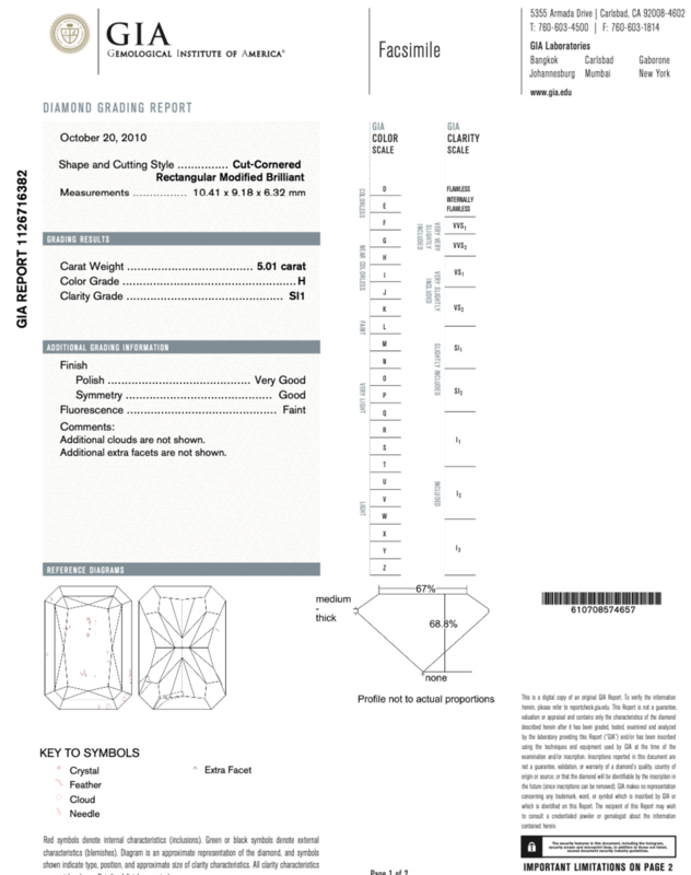 GIA copy, 2010, Report number 1126716382, 5.01 carats, H color, SI1 clarity, Faint fluorescence