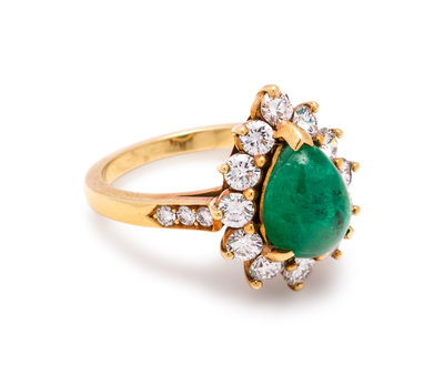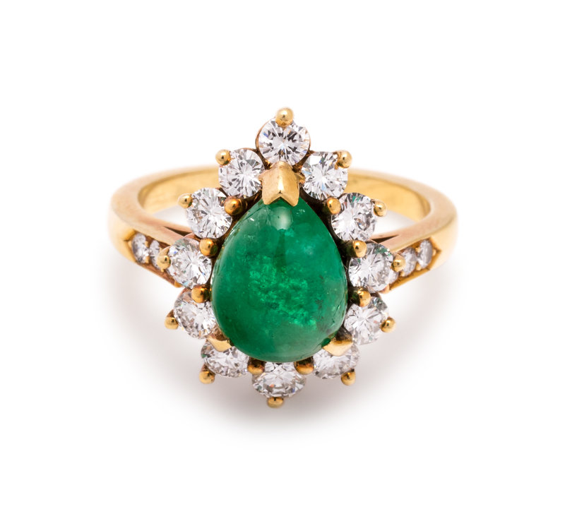 Containing one pear shape cabochon cut emerald measuring approximately 10.50 x 8.00 mm and 18 round brilliant cut diamonds weighing approximately 1.30 carats total.