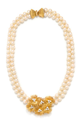 Consisting of a yellow gold floral motif enhancer containing 18 round brilliant cut diamonds weighing approximately 1.30 carats total, suspended from a double strand necklace containing numerous pearls measuring approximately 7.50 mm in diameter, strung knotted with a yellow gold clasp containing five round brilliant cut diamonds.