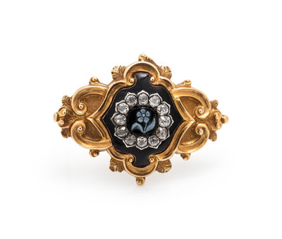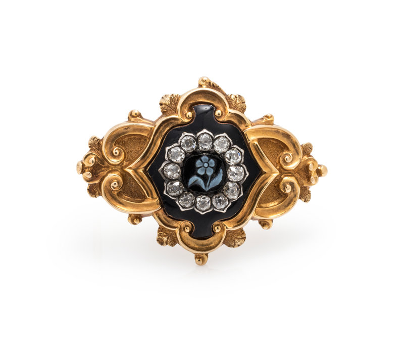 Consisting of a yellow gold foliate motif brooch with black enamel detail, surmounted with a carved flower hardstone and surrounded by 12 old mine cut diamonds, the reverse with personalized script engraving.
