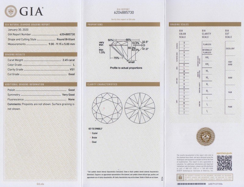 GIA, 2020, Report number 6204885730, 2.45 carats, L color, VS1 clarity, No fluorescence