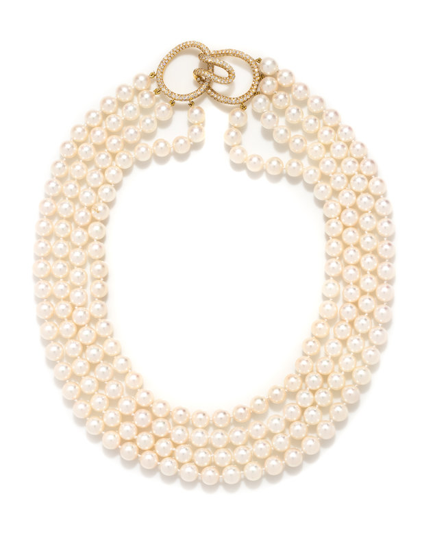 Consisting of four strands of pearls measuring approximately 8.50 mm in diameter, strung knotted with a yellow gold clasp containing numerous round brilliant cut diamond weighing approximately 4.70 carats total.