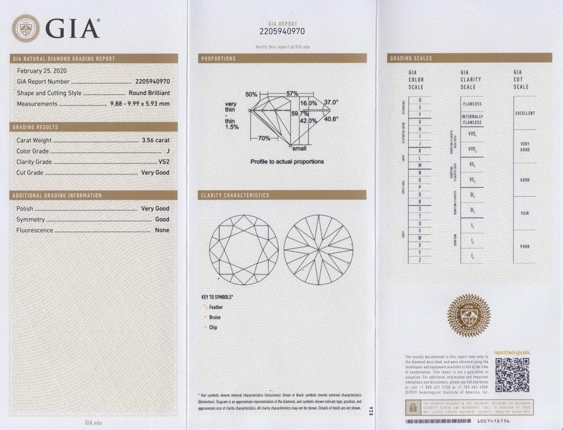 GIA, 2020, Report number 2205940970, 3.56 carats, J color, VS2 clarity, No fluorescence