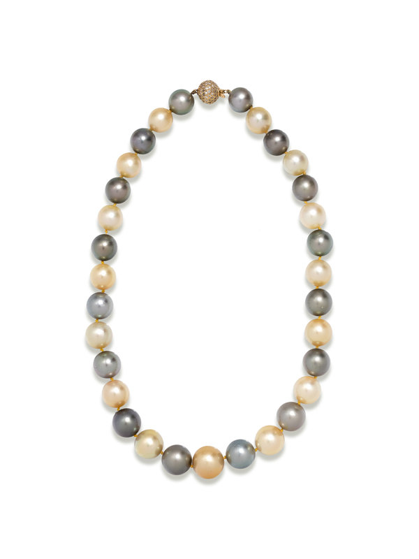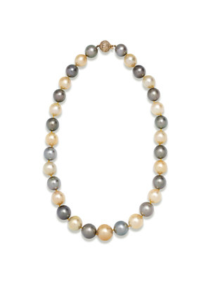 Consisting of alternating grey and golden pearls measuring approximately 11.50-15.00 mm in diameter, strung knotted with yellow gold clasp containing numerous round brilliant cut diamonds.