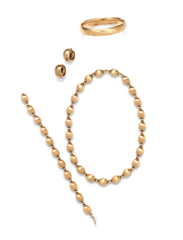Consisting of a necklace containing alternating brushed and polished beads with matching bracelet, together with a pair of brushed gold hoop earclips and bangle bracelet, hinged with side clasp.
