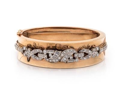 Consisting of a platinum topped gold bracelet containing 10 baguette cut diamonds weighing approximately 0.40 carat total, 32 round brilliant cut diamonds weighing approximately 0.95 carat total and 33 single cut diamonds, surmounted on a later yellow gold hinged bangle bracelet.