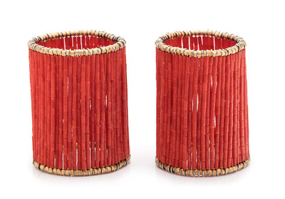 Consisting of two matching bracelets with tubular coral beads strung on white gold wire bars, with textured yellow gold connector links strung on flexible spring wire.