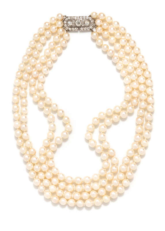 Consisting of four strands of pearls measuring approximately 7.50 mm in diameter strung knotted with the clasp containing one old European cut diamond weighing approximately 0.80 carat, two old European cut diamonds weighing approximately 0.80 carat total and 24 old European cut diamonds weighing approximately 1.68 carats total. Mounted in platinum.