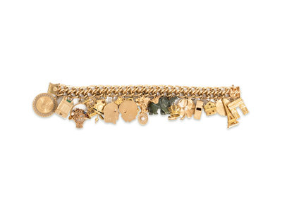 Consisting of a double curb link bracelet suspending a Scorpio disc charm, a building charm with green enamel, a flower basket charm containing four gemstones and one cultured pearl, a ski lift charm, an I LOVE YOU charm, a cuckoo clock charm with enamel detail, a girl silhouette charm, a boy silhouette charm, a VENEZIA Rialto bridge charm, a Mickey Mouse charm, a tennis racket charm containing one cultured pearl, a sand dollar charm, a carved hardstone elephant charm containing two gemstones, a gavel charm, a crown charm, a shamrock charm containing one cultured pearl, a SEA ISLAND disc charm, a whistle charm, a house charm, a Scorpio disc charm, an Eiffel Tower charm and an Arc de Triomphe charm.