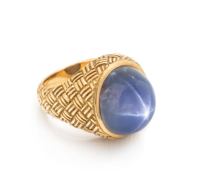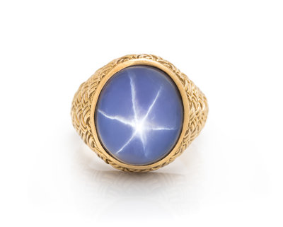 Containing one oval shape cabochon cut star sapphire measuring approximately 15.50 x 13.50 x 13.20 mm. Mounted in yellow gold.