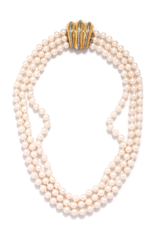 Consisting of three strands of pearls measuring approximately 7.10-7.35 mm in diameter, strung knotted with a yellow gold clasp containing 56 round brilliant cut diamonds weighing approximately 0.25 carat total.