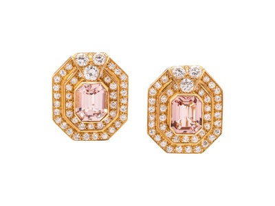 Containing two emerald cut morganite measuring approximately 12.00 x 10.00 mm and 92 round brilliant cut diamonds weighing approximately 4.20 carats total, posts with clip backs. Mounted in yellow gold.