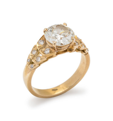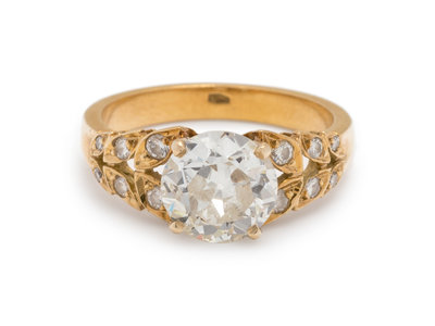Containing one circular brilliant cut diamond weighing 2.15 carats and 12 round brilliant cut diamonds weighing approximately 0.12 carat total. Mounted in yellow gold.