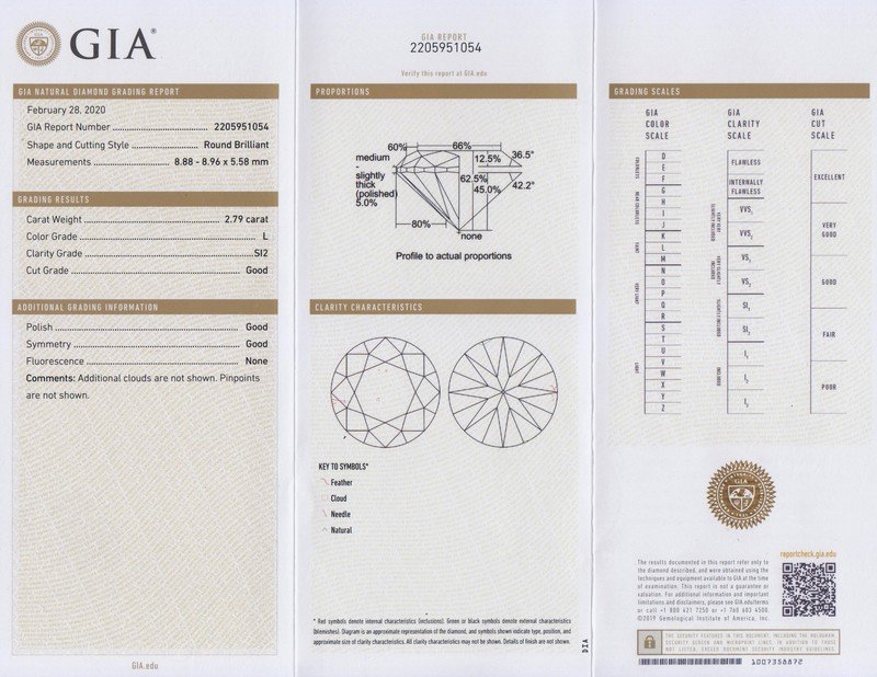 GIA, 2020, Report number 2205951054, 2.79 carats, L color, SI2 clarity, No fluorescence