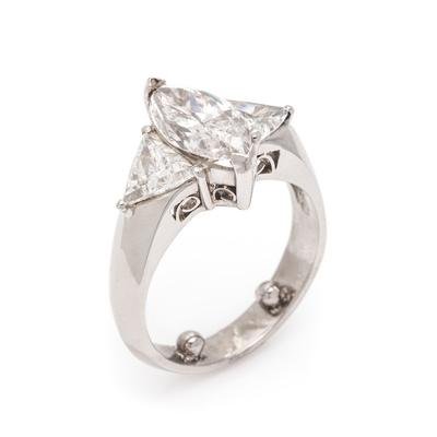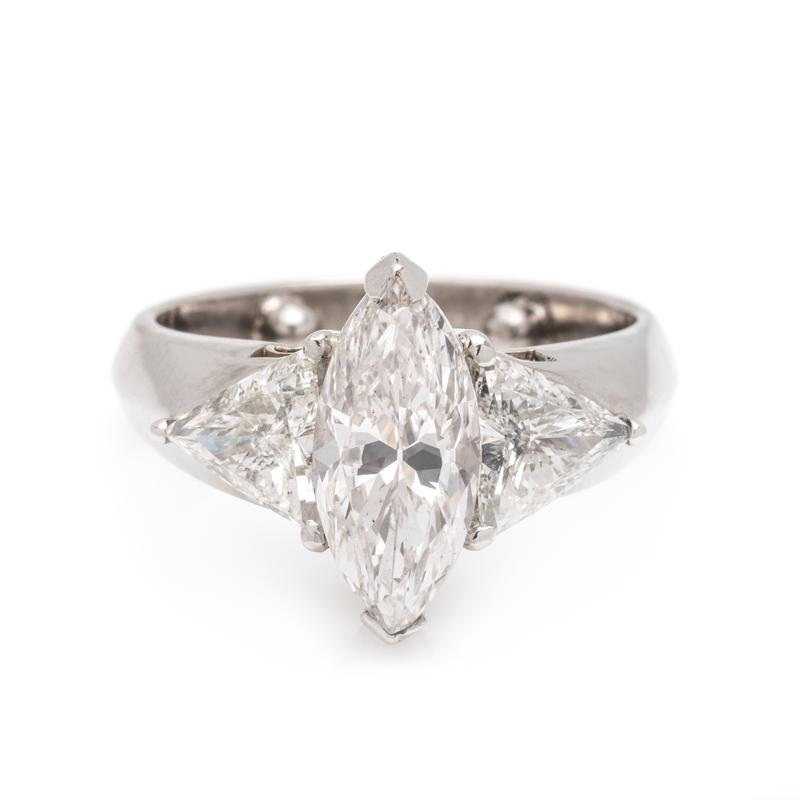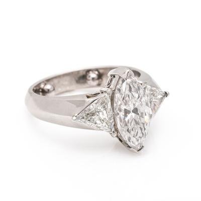 Containing one marquise brilliant cut diamond weighing 2.57 carats and two triangular brilliant cut diamonds weighing approximately 1.50 carats total. Mounted in platinum.