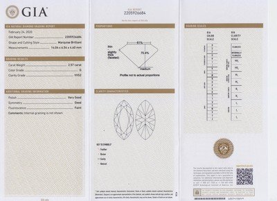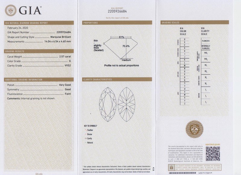 GIA, 2020, Report number 2205926684, 2.57 carats, G color, VVS2 clarity, Faint fluorescence