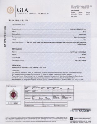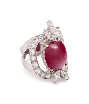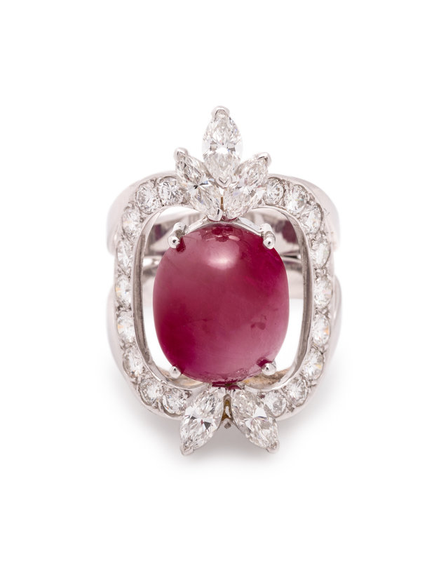 Containing one oval shape cabochon cut ruby measuring approximately 13.30 x 11.30 x 6.55 mm, five marquise cut diamonds and 28 round brilliant cut diamonds weighing approximately 2.50 carats total. Mounted in white gold.