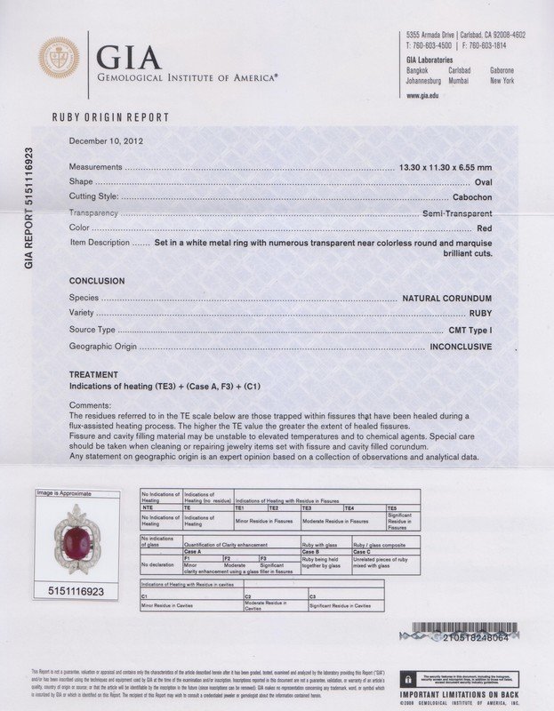 GIA, 2012, Report number 5151116923, Natural Corundum, Ruby, Heated