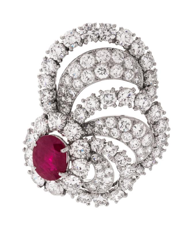 Containing one oval mixed cut ruby measuring approximately 9.00 x 7.00 mm and numerous round brilliant and single cut diamonds weighing approximately 5.95 carats total. Mounted in platinum and white gold.