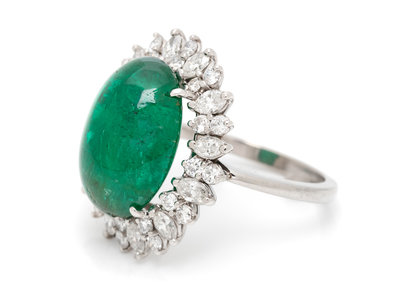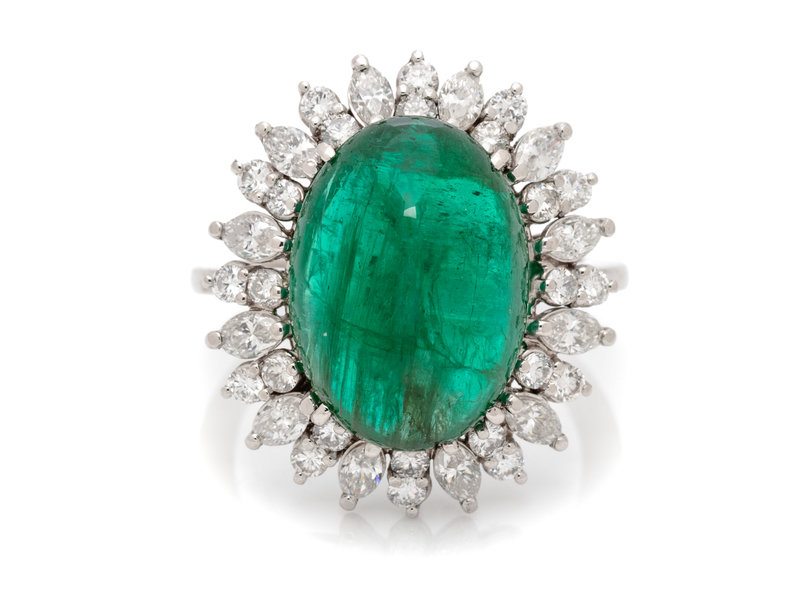 Containing one oval shape cabochon cut emerald measuring approximately 15.50 x 11.15 x 7.40 mm, 12 marquise cut diamonds weighing approximately 0.60 carat total and 24 round brilliant cut diamonds weighing approximately 0.60 carat total. Mounted in platinum.