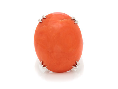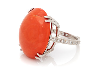 Containing one oval shape cabochon cut coral measuring approximately 26.00 x 20.60 x 10.50 mm and 52 round brilliant cut diamonds weighing approximately 0.50 carat total. Mounted in platinum.