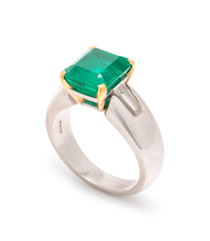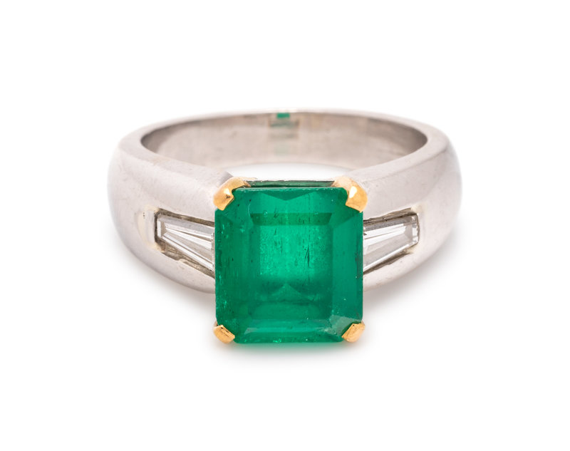 Containing one emerald cut emerald measuring approximately 10.05 x 9.10 x 6.50 mm and two tapered baguette cut diamonds weighing approximately 0.60 carat total. Mounted in platinum and yellow gold.