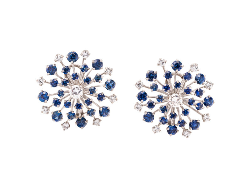 Containing 18 round brilliant cut diamonds weighing approximately 0.90 carat total and numerous round mixed cut sapphires measuring approximately 2.00-3.00 mm in diameter. Mounted in platinum, with white gold clip backs.