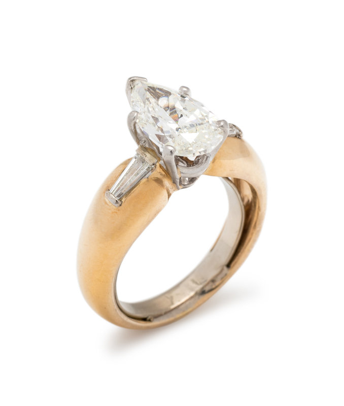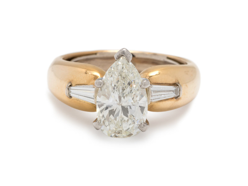 Containing one pear shape brilliant cut diamond weighing 2.65 carats and two tapered baguette cut diamonds weighing approximately 0.30 carat total. Mounted in yellow gold and platinum.
