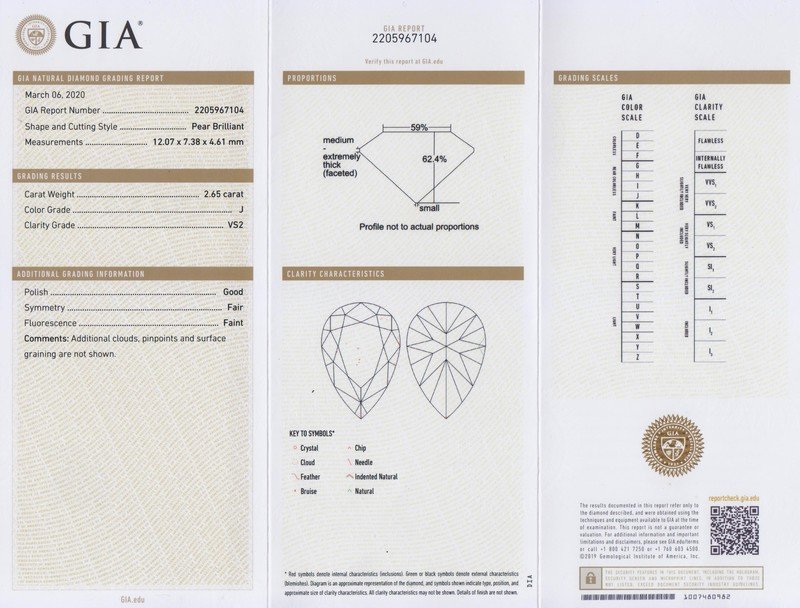 GIA, 2020, Report number 2205967104, 2.65 carats, J color, VS2 clarity, Faint fluorescence