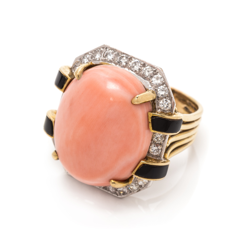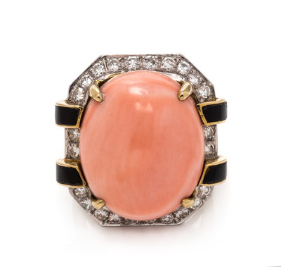 CORAL, DIAMOND AND ONYX RING