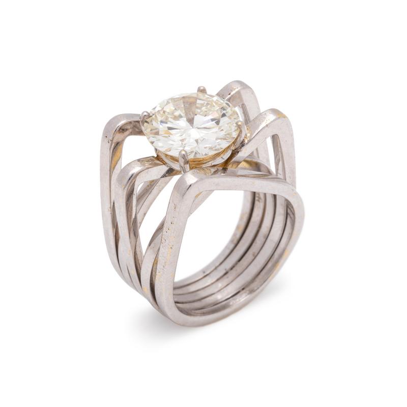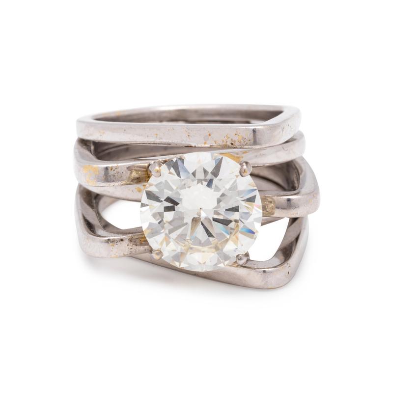 Containing one round brilliant cut diamond weighing 4.21 carats. Mounted in white gold.