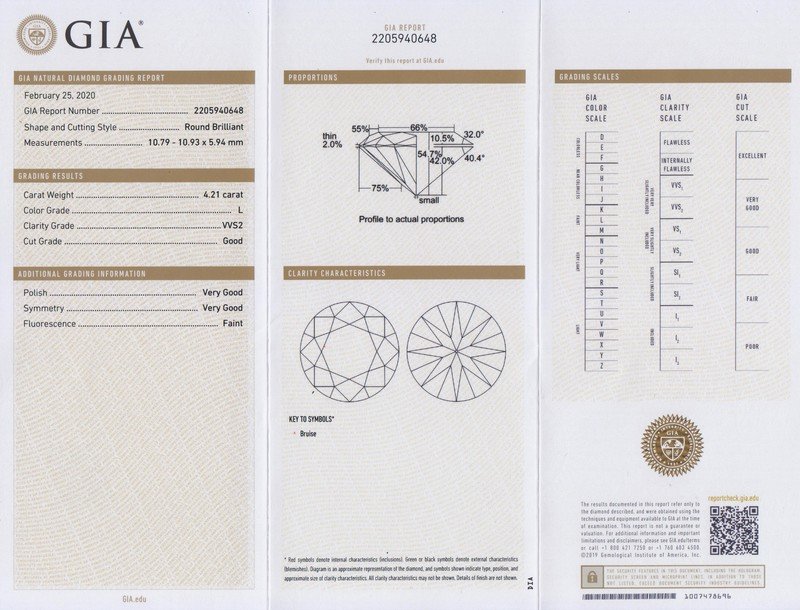 GIA, 2020, Report number 2205940648, 4.21 carats, L color, VVS2 clarity, Faint fluorescence