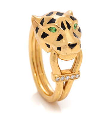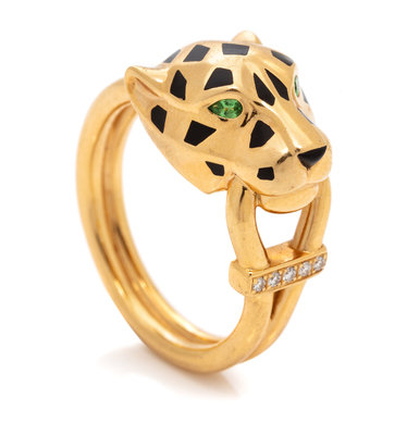Consisting of a panther head with black lacquer spots, two tsavorite garnet eyes and five round brilliant cut diamonds.